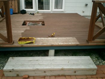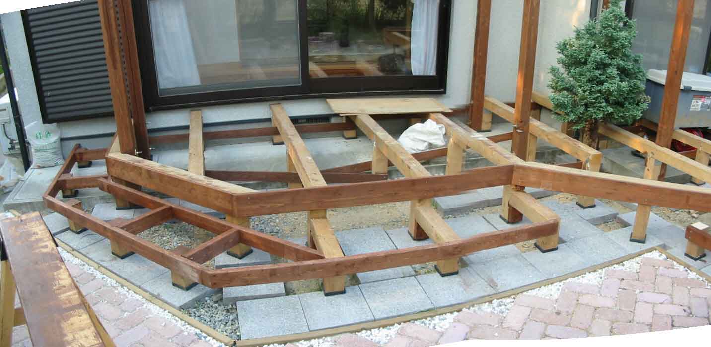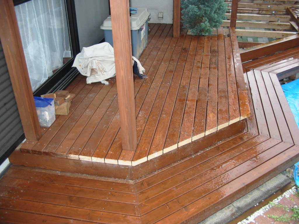 先週末の梅雨の合間を縫って、なんとか小さい方のデッキ張りが完成。